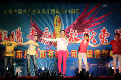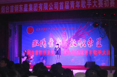 為慶祝中國共青團(tuán)建團(tuán)91周年,提升廣大團(tuán)員青年的綜合素質(zhì),給青年人施展才華搭建平臺(tái),營造健康活潑的文化氛圍,使青年人在東星這個(gè)大家庭里生活得更加陽光、更加自信、更加充實(shí),更好地為東星的發(fā)展建設(shè)貢獻(xiàn)青春、智慧和力量,同時(shí),也為了傳遞正能量,實(shí)現(xiàn)廣大團(tuán)員、青年的青春夢,2013年5月8日,煙臺(tái)東星集團(tuán)有限公司在職工活動(dòng)中心隆重舉辦了以“激揚(yáng)青春•放歌東星”為主題的煙臺(tái)東星集團(tuán)首屆青年歌手大賽,公司本部助理以上領(lǐng)導(dǎo)親臨比賽現(xiàn)場并為獲獎(jiǎng)選手頒發(fā)了獎(jiǎng)狀。