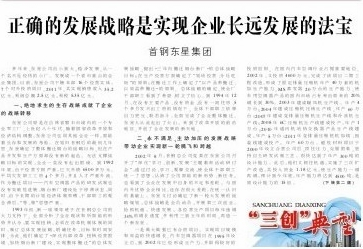 在8月1日發(fā)表的日?qǐng)?bào)(總第6037期)頭版,刊登了題目為《正確的發(fā)展戰(zhàn)略是實(shí)現(xiàn)企業(yè)長(zhǎng)遠(yuǎn)發(fā)展的法寶》的文章,廣泛宣傳、介紹東星集團(tuán)在開展“三創(chuàng)”活動(dòng)中的典型經(jīng)驗(yàn),總公司網(wǎng)站同日轉(zhuǎn)載。